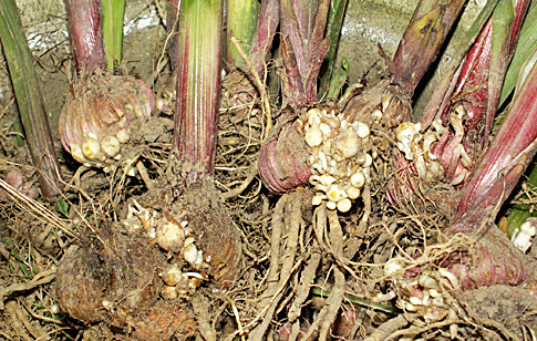 Чтобы купить качественный материал для посадки необходимо иметь минимальное представление о строении клубнелуковицы, порядке размножения и времени выращивания. Клубнелуковица представляет собой разросшиеся основания клубневых листьев. В верхней части располагается одна (иногда 2 – 3) центральная почка, ниже, диаметрально расположены спящие почки (латеральные), покрытые сухими пленками. Верхние почки прорастают и дают непосредственно стебель, нижние дают выросты – столоны, на которых образуются мелкие клубеньки, покрытые твердой капсулой, называемые деткой.